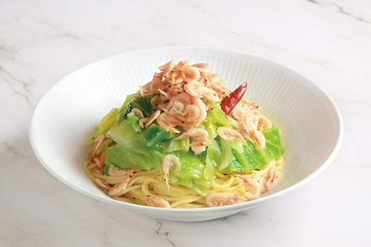 釜揚げ桜えびと柔らかく甘い春キャベツとをアンチョビソースで仕上げた春の定番パスタ。