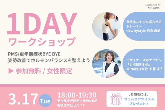 合同会社すずはなは、女性のウェルビーイング推進活動の一環として、NewMyStyle 代表 君島 麻美氏とJUNA株式会社 代表取締役 安藤 淳子氏を招き、1Dayワークショップ「PMS症状BYE BYE、姿勢改善でホルモンバランスを整えよう」を2026年3月17日(火)18:00から自社(東京都千代田区一番町6番地相模屋本社ビル7階)で開催します。