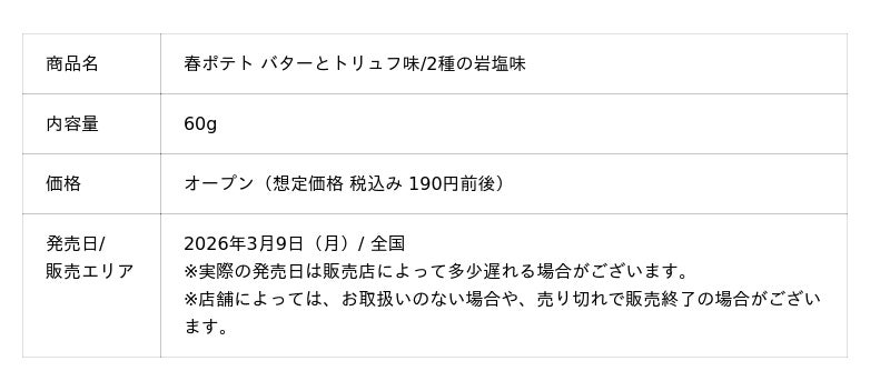 カルビー株式会社(本社:東京都千代田区、代表取締役社長兼CEO:江原 信)は、2年ぶりに“至福のおいしさ”に生まれ変わった春季限定の厚切りポテトチップス『春ポテト バターとトリュフ味/2種の岩塩味』を、2026年3月9日(月)から全国で期間限定発売します(2026年6月上旬終売予定)。