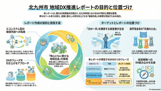 本レポートは、北九州地域のDXを「次のフェーズ」へ進めるための指針として、企業・支援機関・行政・金融機関・大学などが連携する「地域共創型DX」の方向性を提示するものです。