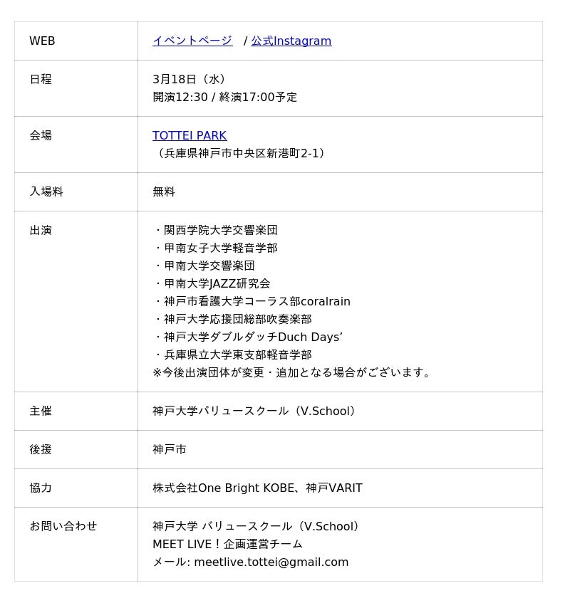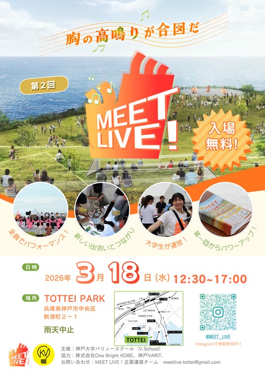 株式会社One Bright KOBE(住所:神戸市中央区、代表取締役社長 渋谷 順)は、神戸大学 バリュースクール(V.School)(住所:兵庫県神戸市、バリュースクール長 玉置 久)と、「神戸ウォーターフロントにZ世代のコミュニティを創発する」を目指した取り組みとして、神戸大学バリュースクール企画運営チームと連携し、3月18日(水)にTOTTEI PARKで開催される学生主体のダンスパフォーマンスイベント第2回『MEET LIVE!』の開催・運営に協力いたします。