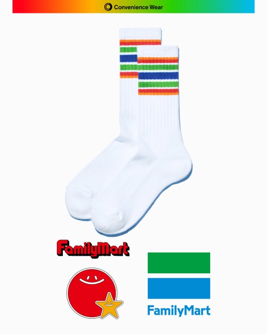【内容】男女兼用のラインソックスです。ファミリーマート45周年記念カラーとして、1980年代までファミリーマートのシンボルマークとして使用されていた「太陽と星」とファミリーマートカラーを配色しました。足底はパイル編みの肉厚仕様です。抗菌防臭加工でニオイにくい仕様です。