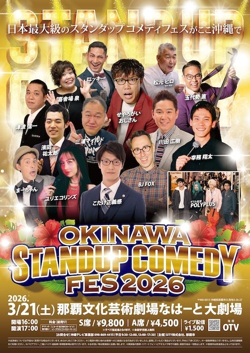 SITY株式会社は、2026年3月21日(土・祝)に那覇文化芸術劇場なはーと 大劇場にて「OKINAWAスタンダップコメディフェス」を開催します。盛り上がりを見せる沖縄コメディシーンの精鋭と全国の実力者が一夜に集い、スタンダップコメディの熱量を体感できるステージをお届けします。
