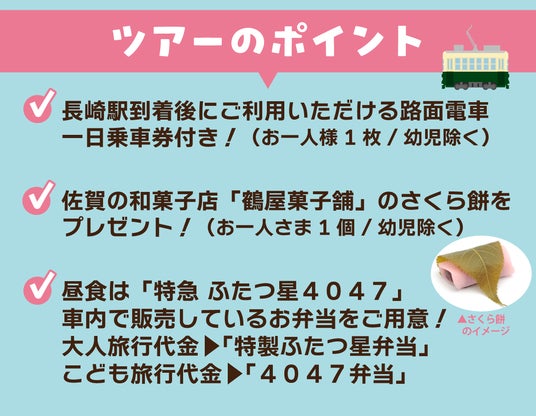 JR九州では、「特急 ふたつ星4047」に乗車できるオリジナルツアー「特急 ふたつ星4047」で行く!春の長崎日帰りたびを発売中です。ツアー当日は、佐賀の和菓子店「鶴屋菓子舗」のさくら餅をプレゼントいたします。(お一人さま1個/幼児除く)ご昼食は「特製ふたつ星弁当」(こどもは4047弁当)をご用意し、長崎駅到着後にご利用いただける路面電車一日乗車券が付いております。ぜひこの機会に「特急 ふたつ星4047」に乗って、春の長崎の旅に出かけてみませんか? 皆さまのご参加をお待ちしております。