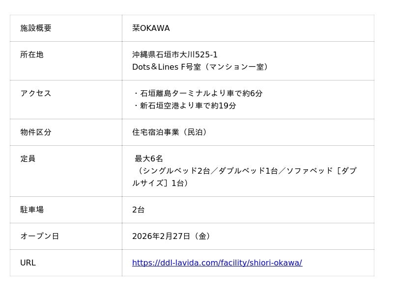 株式会社D&Dホールディングス(本社:東京都中央区、代表取締役社長:竹村 嘉規)のグループ会社である株式会社D&Dマネージメント(本社:東京都中央区、代表取締役社長:竹村 嘉規)は、沖縄県石垣市にて、宿泊施設(民泊)「栞OKAWA(しおり おおかわ)」を2026年2月27日(金)にオープンいたしました。