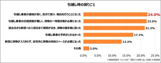 引越し時の困りごとについては、「引越し業者の価格が高く、自分で搬入・搬出を行うことになった」が 24.0% で最多となりました。次いで、「引越し業者の日程調整が難しく、荷物の一時置き場が必要になった」(22.0%)、「退去日から新居への入居日まで期間が空き、荷物の置き場に困った」(21.3%)が続いています。