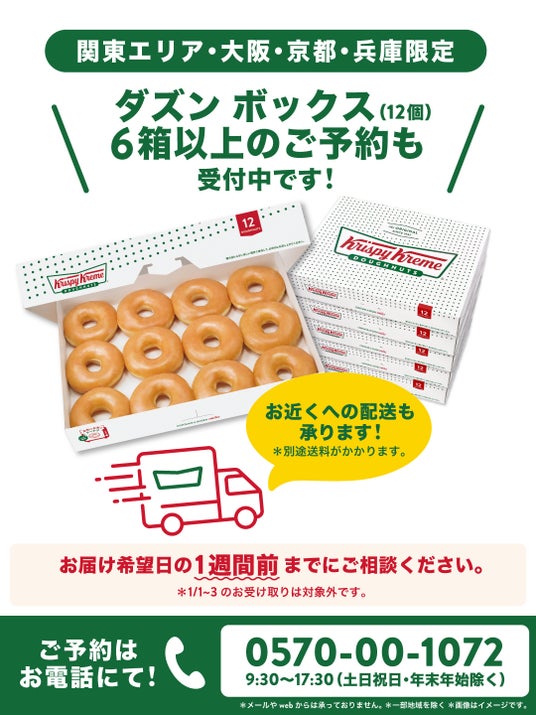 これまでは10ダズン(1ダズン=12個)など大量のご注文をいただいた場合、お受け取りが店舗に限られていましたが、本サービスの開始により、お客様ご指定の場所までお届けすることが可能になり、職場でのパーティーやイベントなど、“たくさんの人とシェアするシーン”に、クリスピー・クリーム・ドーナツを手軽にお楽しみいただくことができるようになりました。ご予約はお届け希望日の1週間前までにお電話にて承ります。