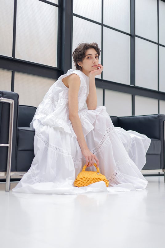 レースでティアードを表現したボリュームたっぷりのノースリーブドレスに同デザインのトップスをレイヤード。アクセントに人気のLUNEバッグの新色イエローをプラス。