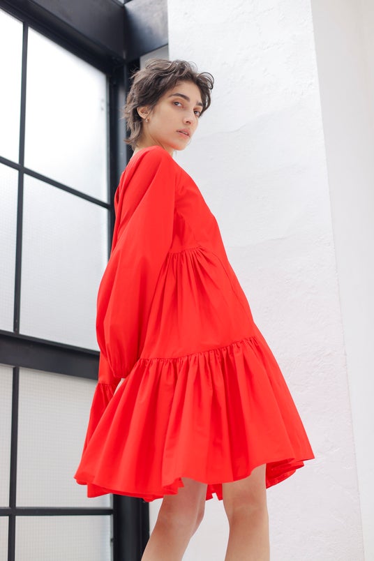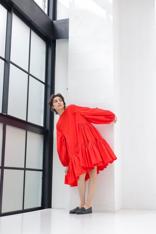 今回のコレクションテーマを体現するような色鮮やかなレッドのBYWARDが登場。サイドに入った柔らかいティアードデザインが春の訪れを感じさせます。