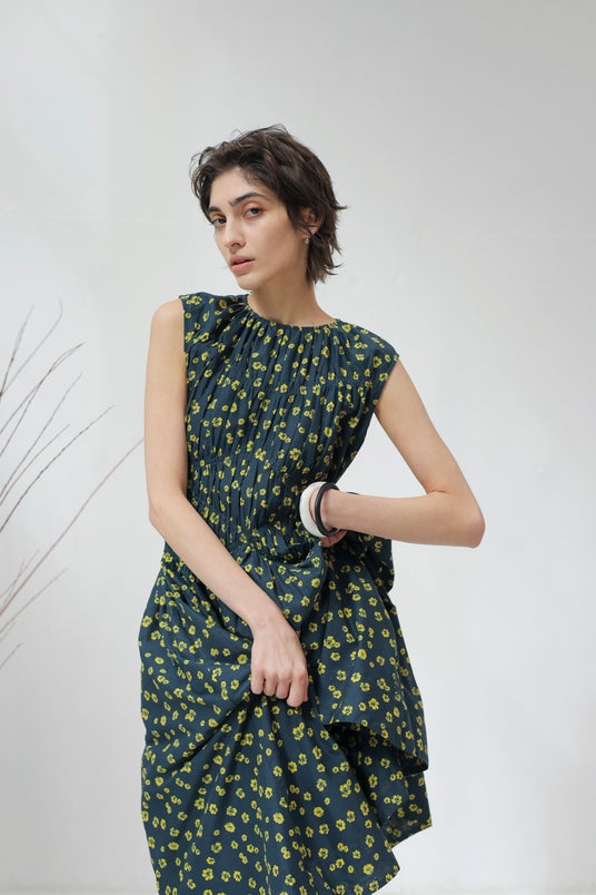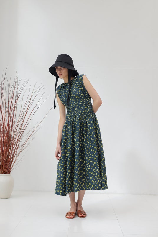 オリジナルのデジタルフラワープリントが軽やかに揺れる心地良さ抜群のコットンボイルドレス。マーレットのバケットハットや存在感のあるブレスレットをあわせ、洗練されたスタイルに。