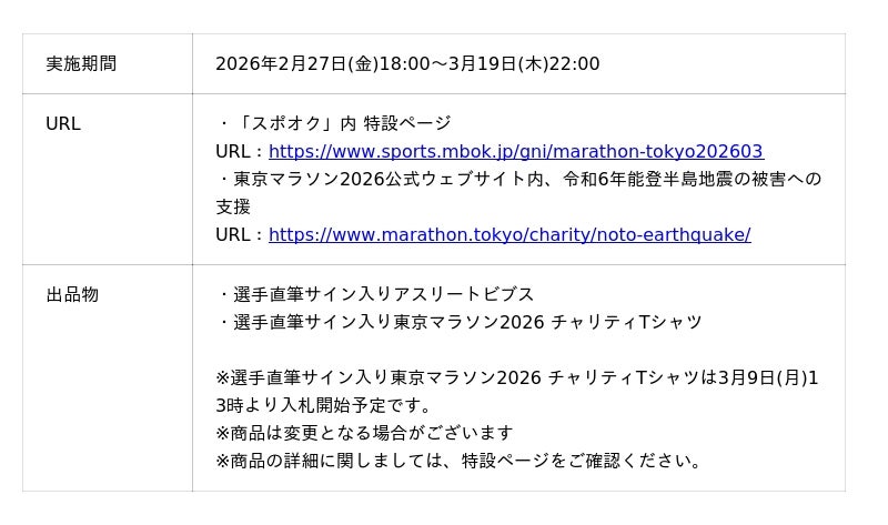 株式会社モバオク(本社:東京都渋谷区、代表取締役社長:小一原 宏樹、以下モバオク)がエンゲート株式会社(本社:東京都中央区、代表取締役:城戸 幸一郎、以下エンゲート)と業務提携し提供するスポーツチーム公式オークションサービス「スポオク」にて、一般財団法人東京マラソン財団が実施する「東京マラソン2026 チャリティオークション #能登のために」を2026年2月27日(金)から開催します。