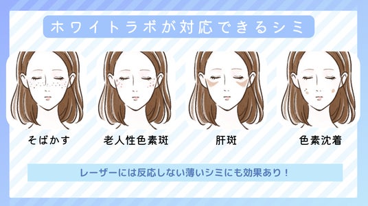 ホワイトラボは、幅広いシミ悩みに対応可能なスポットシミケアメニューとして注目されています。そばかす(雀卵斑)や老人性色素斑、肝斑、日焼けによる色素沈着、炎症後色素沈着など、さまざまな色素悩みにアプローチできる点が特徴です。