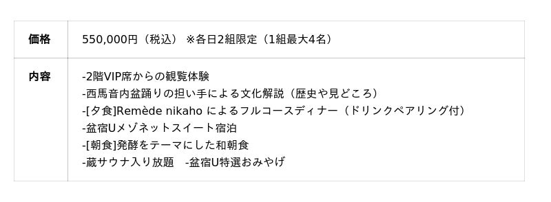 2年目となる今年は、西馬音内盆通りを中心とする地域の文化をより深く体感いただくことのできる2つのプランをご用意しました。混雑を気にすることなく母屋2階のお座敷から会場を俯瞰するように鑑賞できる「VIPプラン」と、奥行きのある空間を活かし1階の土間で視点を自由に変えながら鑑賞できる「プラチナプラン」。どちらも、料理・飲み物と宿泊がセットになっており、1年に3日間しかない西馬音内盆踊りを、盆踊り会場の中心に位置する当施設にゆっくりと滞在しながら贅沢に体感していただけます。従来の「観覧」体験に留まらない、盆宿Uでの滞在を通じて西馬音内盆踊りを五感で体感する唯一無⼆の「鑑賞」体験を。