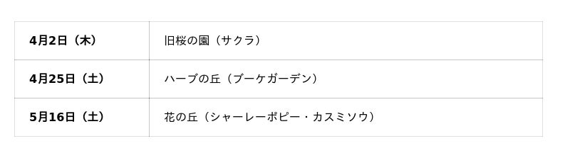 期間中はナノハナを皮切りにサクラ、チューリップ、ネモフィラ、シャーレーポピーなどが次々と開花・見頃を迎えます。また、春限定の飲食メニューや、花の魅力をより楽しむことができるイベントも多数開催予定です。