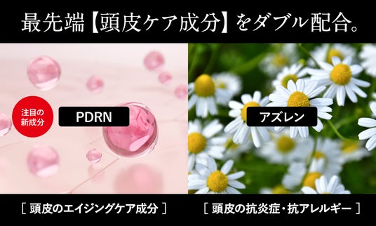 これから生まれる新しい髪の毛が、強く若々しく、潤っていなければその後のヘアケア・トリートメントも効率的に行うことができません。そのためにKYOTO BEAUTYが力を入れたのが頭皮ケア(スカルプケア)です。世界的に流行しつつあるエイジングケア成分『PDRN』をヘアケア製品に採用。頭皮の若々しさをサポートします。それに加え、抗炎症成分である『アズレン』を配合。紫外線やカラー・パーマ等による頭皮へのダメージをケアします。