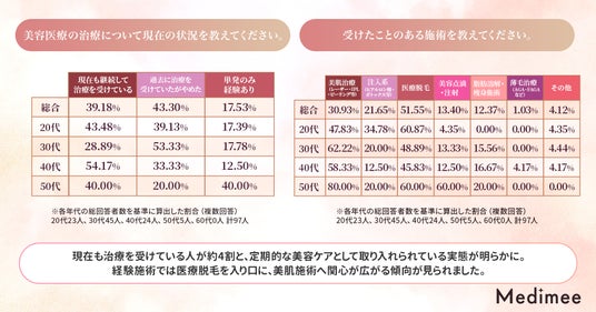 そこでMedimeeでは、20代~50代の美容医療経験者の女性を対象に、美容医療の継続率や通院頻度、やめた理由、費用感、さらに継続しやすくなる仕組みについて調査を実施しました。