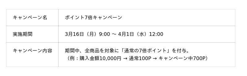 創業70周年を記念し、期間中のご購入で「通常の7倍ポイント」を進呈。