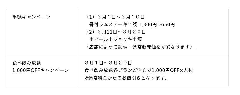半額キャンペーン&食べ飲み放題1,000円OFFキャンペーン同時開催!