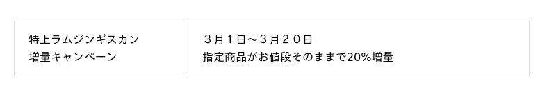 特上ラムジンギスカン20%増量キャンペーンやわらかくクセの少ない仔羊のもも肉を使用した一番人気商品!特上ラムジンギスカンがお値段そのままで増量中。