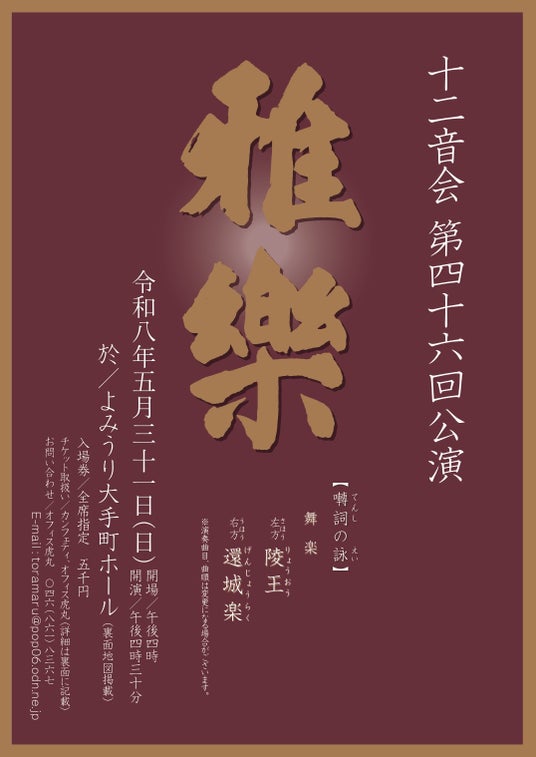 『十二音会 第四十六回公演 雅楽』開催日時:2026年5月31日(日)開場16:00 開演16:30