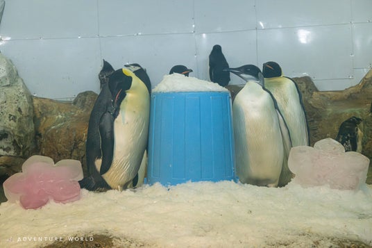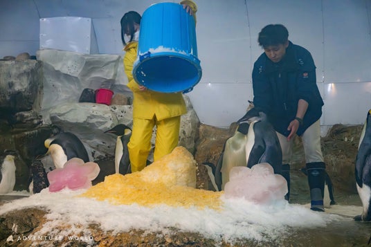 バケツの中には色付きの雪を隠しており、オスの場合はみどり色、メスの場合はオレンジ色が雪崩出る仕掛けです。セレモニー開始前には、エンペラーペンギンの子ども自身もバケツに興味津々の様子でした。