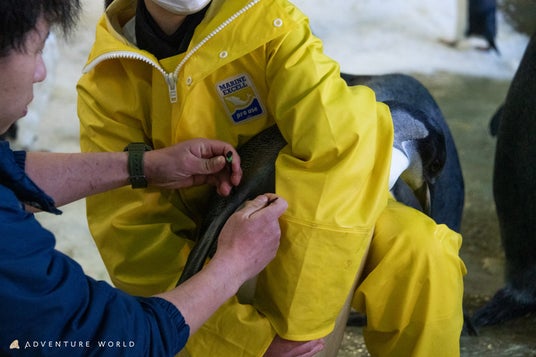 続いて、パークで暮らす約500羽のペンギンの仲間入りを果たす証として、飼育スタッフが個体識別用の「翼帯(よくたい)」を装着。エンペラーペンギンのこどもの正式番号はE044です。これからは群れの一員として歩みを重ねていきます。