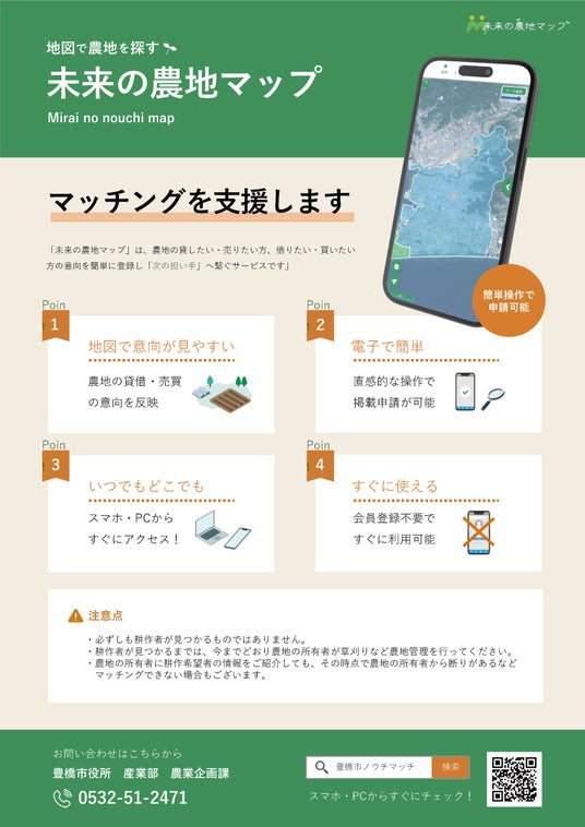 そこで、豊橋市・蒲郡市・田原市の連携システム「未来の農地マップ」を使って、農地を貸したい・売りたい人と農地を探している人のマッチングを支援する取り組みが令和8年2月3日(火)よりスタートしました。