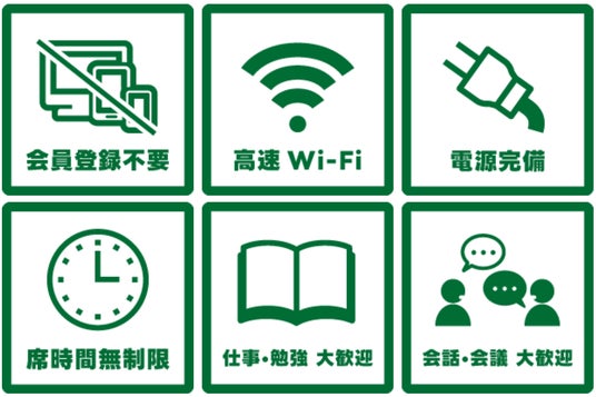 利用方法:ドリンク購入後、時間制限なくご利用可能。会員登録・アプリ不要