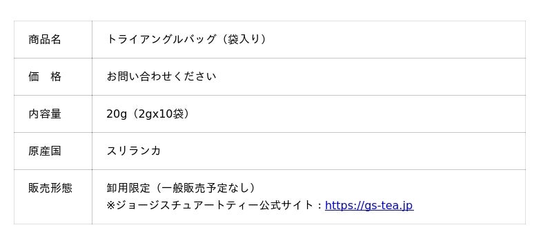 「美と健康を楽しもう」をキーフレーズに、上質な食とライフスタイルを提案する株式会社味とサイエンス(本社:東京都中央区)は、スリランカ最古の紅茶ブランド「George Steuart Tea(ジョージスチュアートティー)」から、ホテル・レストランにおすすめの新商品「トライアングルバッグ(袋入り)」を卸限定で発売いたします。