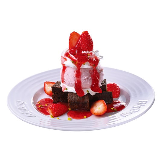 「ストロベリーファッジサンデー」は、ほんのり温かいブラウニーに、つぶつぶ食感が楽しいいちごアイス、果肉入りいちごソース、フレッシュないちごを贅沢に重ねたいちごづくしのデザートです。温かいブラウニーと冷たいいちごアイスが織りなす絶妙なハーモニーに、ピスタチオの香ばしい風味や食感がアクセントを加えます。別添えでご提供する国産いちごを使用したいちごソースをかければ、いちごの華やかな香りと甘酸っぱい味わいをお楽しみいただけます。