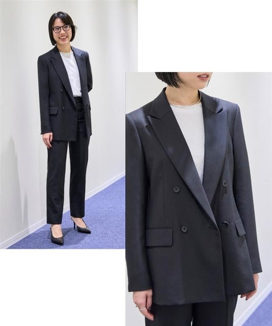 ダブルブレストジャケット×セミストレートのテーパードパンツ