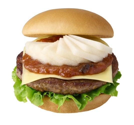 グリーンリーフの上に、福島県産の黒毛和牛を使用したパティを乗せ、スライスチーズとバーベキューソースを重ねました。その上にスライスした梨を合わせています。バーベキューソースは、厳しい栽培条件の下で育てられた「サムライガーリック」の黒ニンニクと会津の白虎みそ、そして福島県産のももピューレを加えたオリジナルのソースです。また梨は、上品な甘みと爽やかな酸味、そしてシャリシャリとした食感の果肉が特徴の、福島市産の「晩三吉(おくさんきち)」を使用しました。お肉の旨みを しっかりと感じられるパティと濃厚なバーベキューソースに、爽やかな梨が合わさることで、最後まで飽きることなく楽しんでいただけるバーガーです。