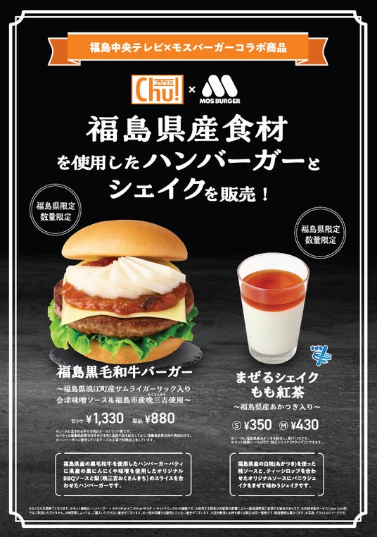 【MOS】福島中央テレビと初コラボ!福島の魅力が詰まったバーガーとシェイクが登場「福島黒毛和牛バーガー」「まぜるシェイク もも紅茶」