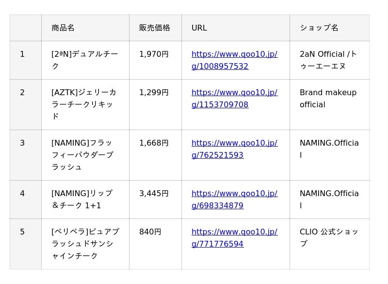 インターネット総合ショッピングモール「Qoo10」を運営するeBay Japan合同会社(本社:東京都港区、代表取締役:グ ジャヒョン)は、Qoo10で人気のコスメカテゴリーの中から、『リップ』『アイシャドウ』『チーク』と、月替わりで1アイテムをピックアップした、月間販売数TOP5※をご紹介していきます。