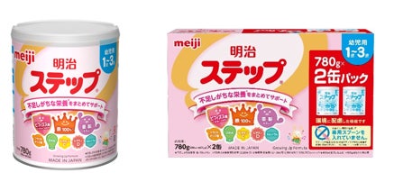 左より「明治ステップ 780g」、「明治ステップ2缶パック」(780g×2) 希望小売価格:左より2,804円(税込)、5,607円(税込)