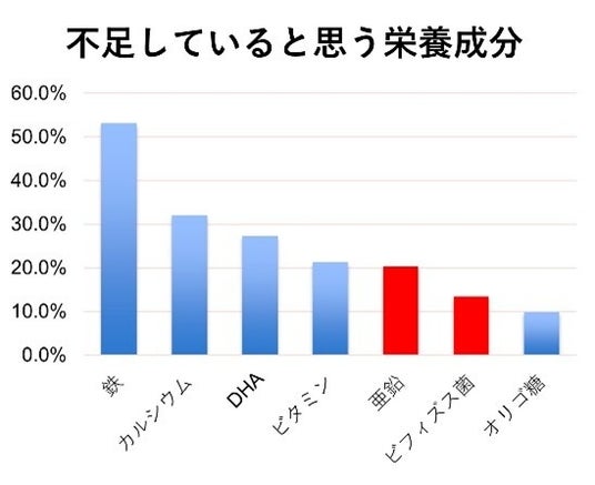 9~18カ月のお子さまを持つ保護者を対象に実施した調査※2では、「子供の健康に対する悩み・心配事」として、「必要な栄養を十分に与えられているかどうか」が最も多く挙げられ、全体の約45%を占めました。また、「お子さまに不足していると思う栄養成分」においては、既に「明治ステップ」がサポートしている鉄、カルシウム、DHA、ビタミンに続き、「ビフィズス菌」と「亜鉛」も挙げられました。