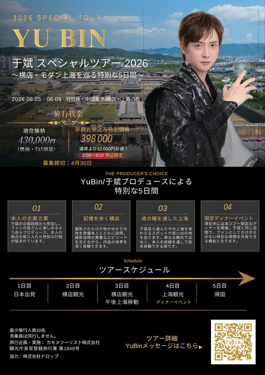 イベント特設サイト:https://kamome-travel.jp/yubin/ツアー名称:「YU BIN / 于斌 スペシャルツアー 2026~横店・モダン上海を巡る特別な5日間~」