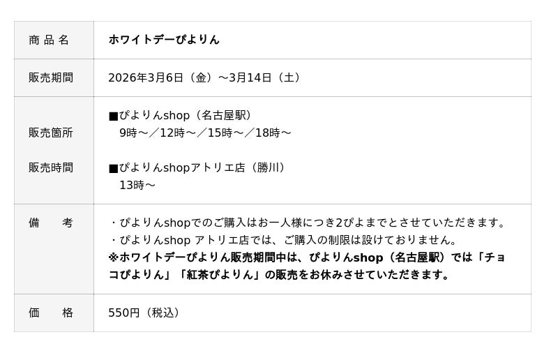 ジェイアール東海フードサービス株式会社(本社:愛知県名古屋市、代表取締役社長:岩下賢一)は、2020年以来の登場となる「ホワイトデーぴよりん」を、2026年3月6日(金)から3月14日(土)までの期間限定で販売いたします。6年ぶりに登場するホワイトデー限定のぴよりんが、大切な人への感謝や想いをやさしく包み込んでお届けします。甘くてふんわり、贈る人も受け取る人も思わず笑顔になる、この時季だけの特別な一品です。