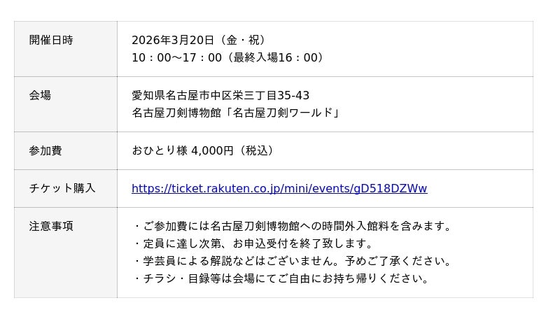 名古屋刀剣博物館「名古屋刀剣ワールド」では、2026年3月20日(金・祝)に「三日月兼光と備前の名刀」特別内覧会を開催します。