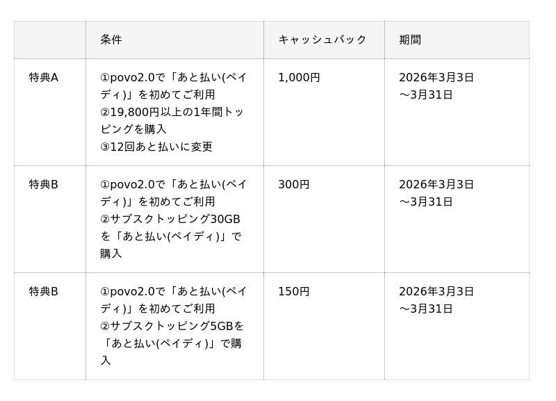 KDDI、沖縄セルラーは、2026年3月3日から3月31日まで、povo2.0において対象のトッピングを購入し、Paidy合同会社が提供するあと払いサービス「ペイディ」を初めてpovo2.0で利用されるお客さまに、最大1,000円のキャッシュバックキャンペーン(以下、本キャンペーン)を実施します。
