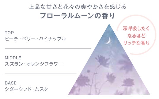 上品な甘さと花々の爽やかさを感じるフローラルムーンの香り。深呼吸したくなるほどリッチな香りで、癒しのバスタイムに。ライフスタイルにマッチしたリラックス感を表現したデザインです。