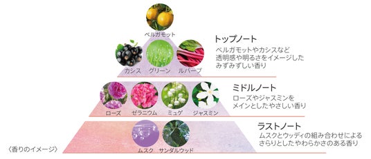 透明感のある澄んだ香りに始まり、やわらかくて包み込むような優しさと、さらりと軽やかさを併せ持つ香りです。