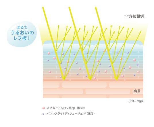 *5 角層内にうるおいをたっぷりと抱え込むように保つことで反射光が増し肌が明るく見える技術