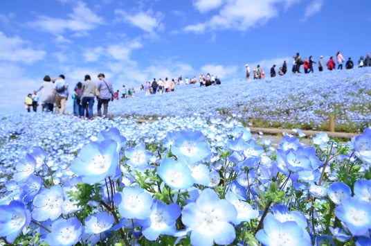 ントを企画しています。「みはらしの丘」を一面の青一色に染めあげる約530万本のネモフィラは、4月中旬~5月上旬に見頃を迎えます。空と海と丘が渾然一体になるパノラマシーンは圧巻です。