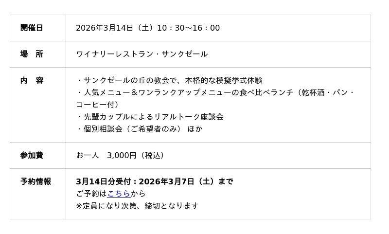 【サンクゼール】3/14 sun 体験型ブライダルフェア開催