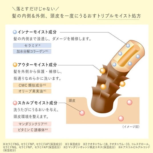 ※セラミドNG、セラミドNP、セラミドAP、加水分解コラーゲン(保湿成分) ※1クオタニウム-18、クオタニウム-33、コレステロール、セラミドNG、セラミドNP、セラミドAP、オリーブ果実油(保湿成分) ※2 γ-ドコサラクトン、(ジヒドロキシメチルシリルプロポキシ)ヒドロキシプロピル加水分解ダイズタンパク(毛髪補修成分)