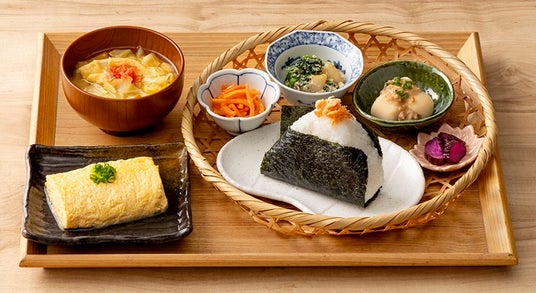 【自家製だし巻き卵定食】選べるおにぎりとお惣菜3種、味噌汁に加え、こだわりの自家製だし巻き卵が楽しめるセットになっています