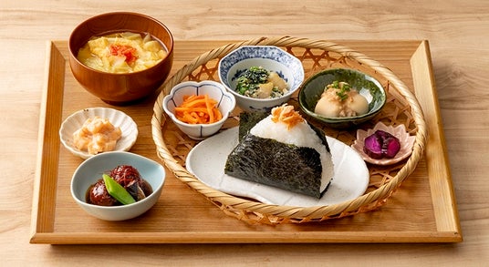 【一汁五菜定食】選べるおにぎりに、5種のお惣菜、野菜の旨みが溶け出した具だくさんの味噌汁がついた定食