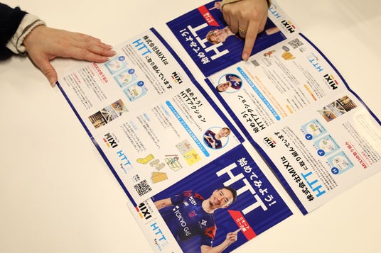 オフィス内では、HTTに関するリーフレットを設置するほか、デジタルサイネージを掲出するなど、従業員がより環境意識を高められるよう啓発活動を開始しました。クリエイティブには当社グループのプロサッカークラブ「FC東京」に所属する長友佑都選手や佐藤恵允選手などを起用しています。