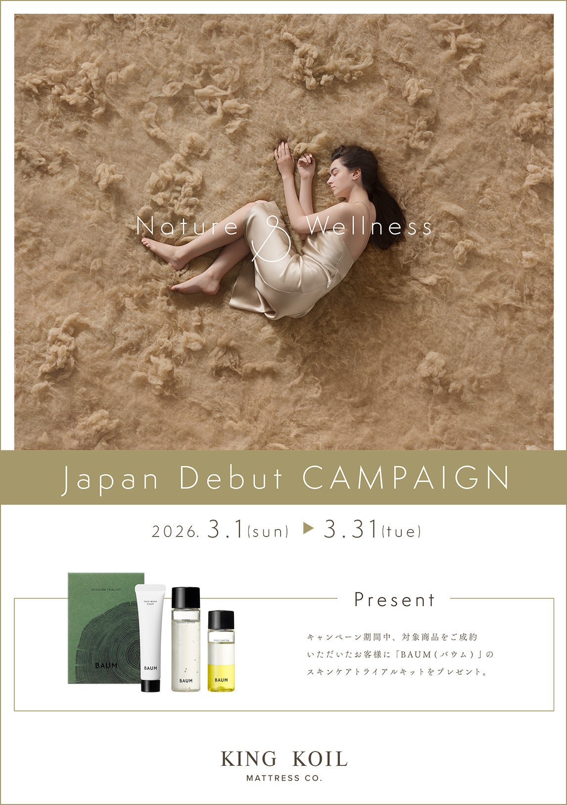 ドリームベッド株式会社(本社:広島市西区、代表取締役社長:三宅弘人)は、米国発のプレミアムマットレスブランド「KING KOIL(キングコイル)」の日本本格デビューを記念し、2026年3月1日(日)より、特別なプレゼントキャンペーンを実施いたします。